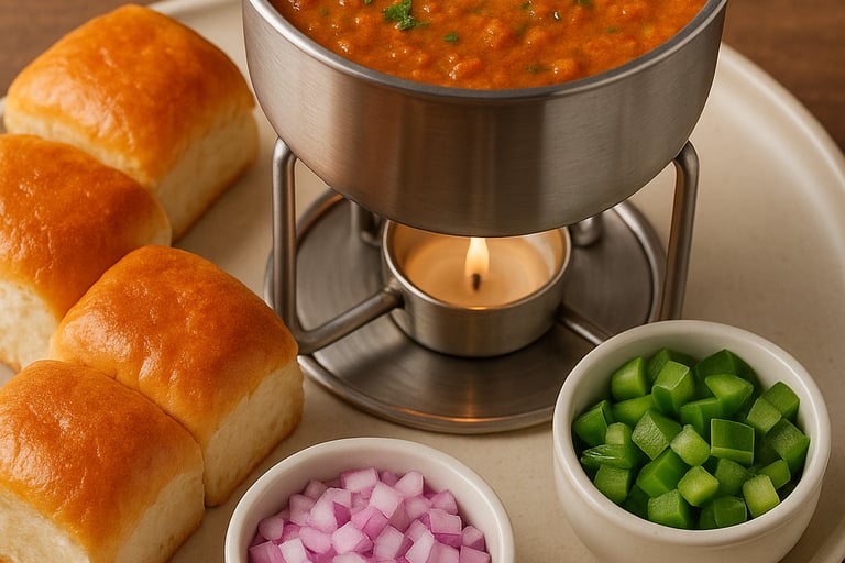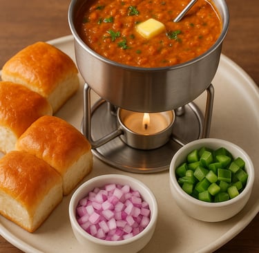 A playful twist on the Mumbai classic — creamy bhaji served fondue-style with butter-toasted mini pav for dipping and sharing.