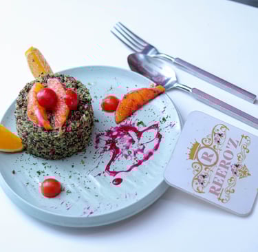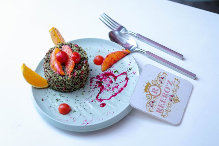 A dish featuring cooked quinoa as its base, combined with various fresh vegetables, herbs, and a dressing
